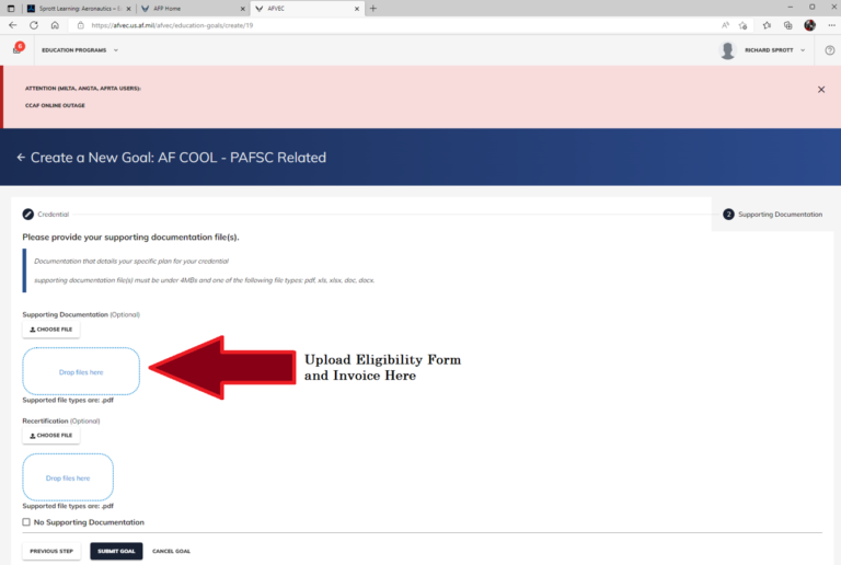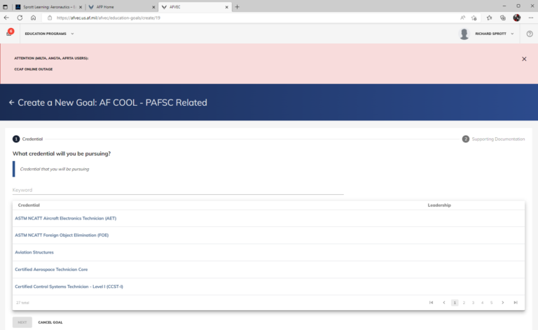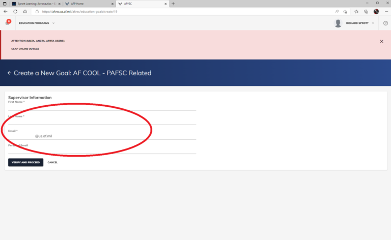 Thank you for verifying your email!We look forward to helping you obtain your certification! From the AF Home Page click AFVEC In AFVEC click Education Goals Click Create New Goal Select AF COOL option that describes you Enter your supervisors info (Use Global!) Pick your credential (AET or GROL) Upload Invoice that we sent you